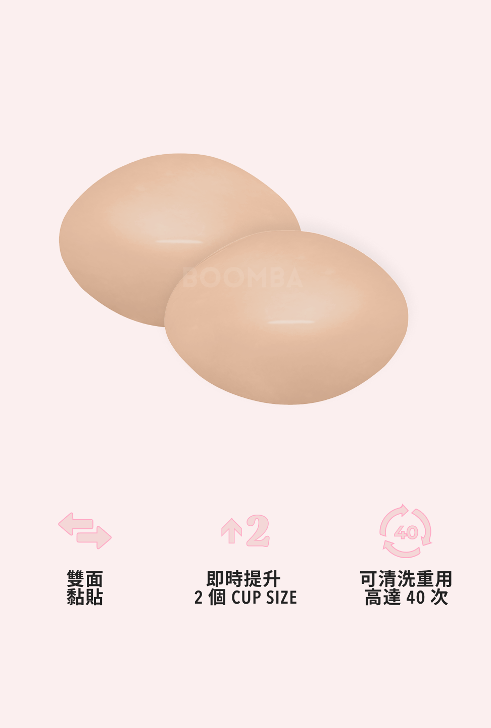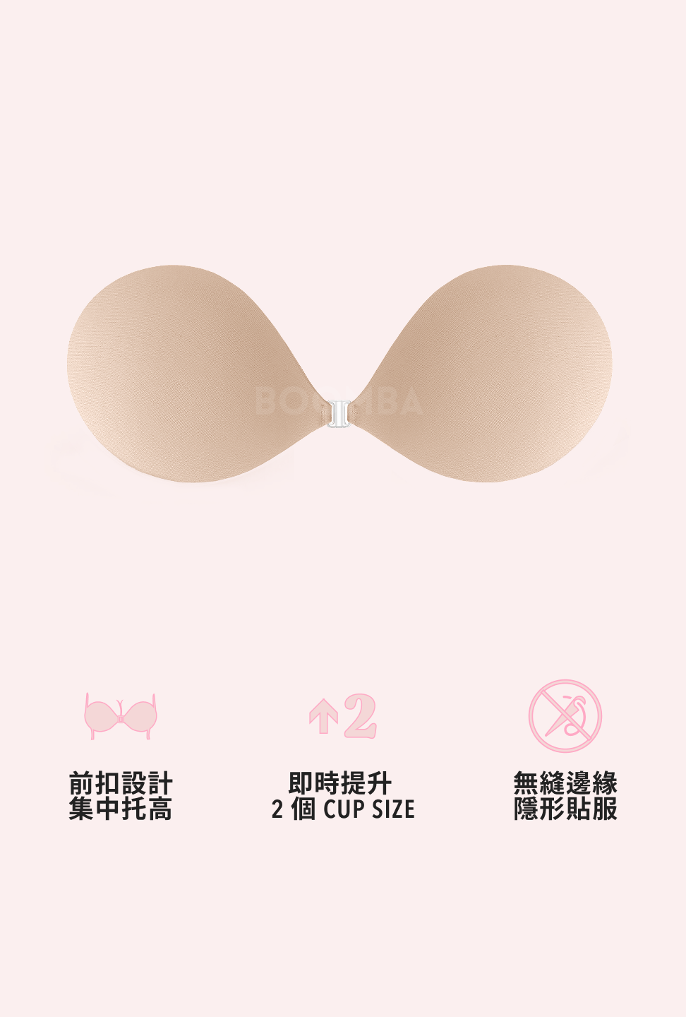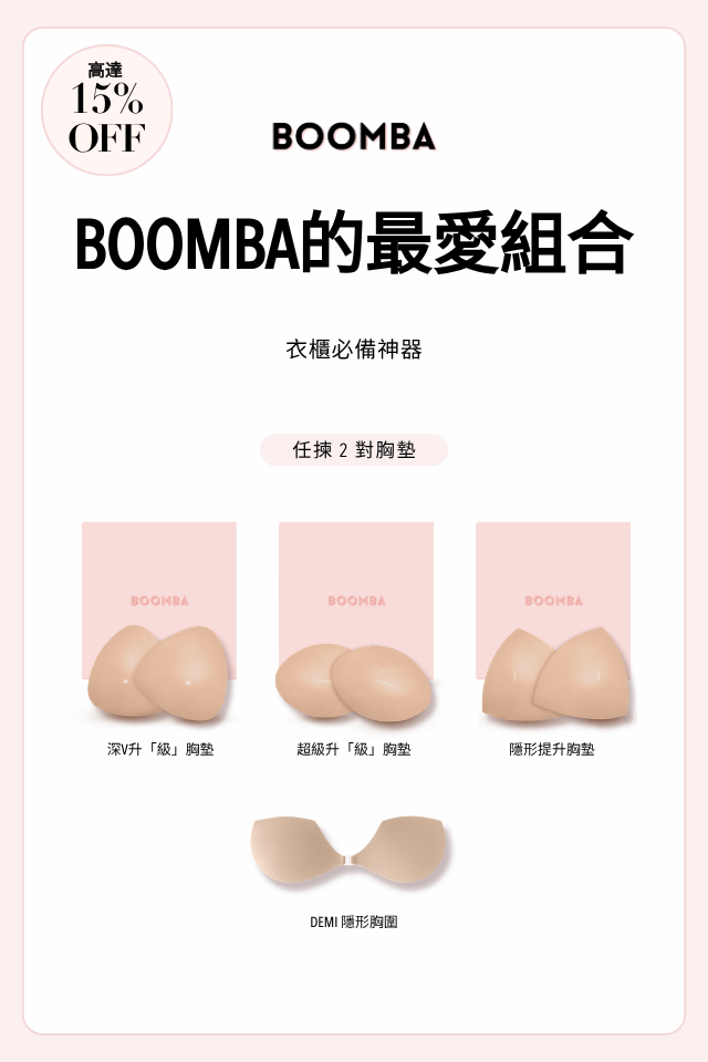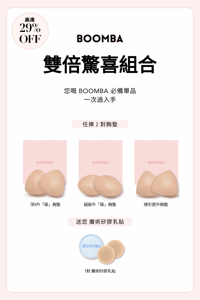 BOOMBA 胸墊有獨特專利設計,具備即時提拉效果,𣊬間提升 2 個 Cup Sizes!一著上身即刻打造完美乳溝!