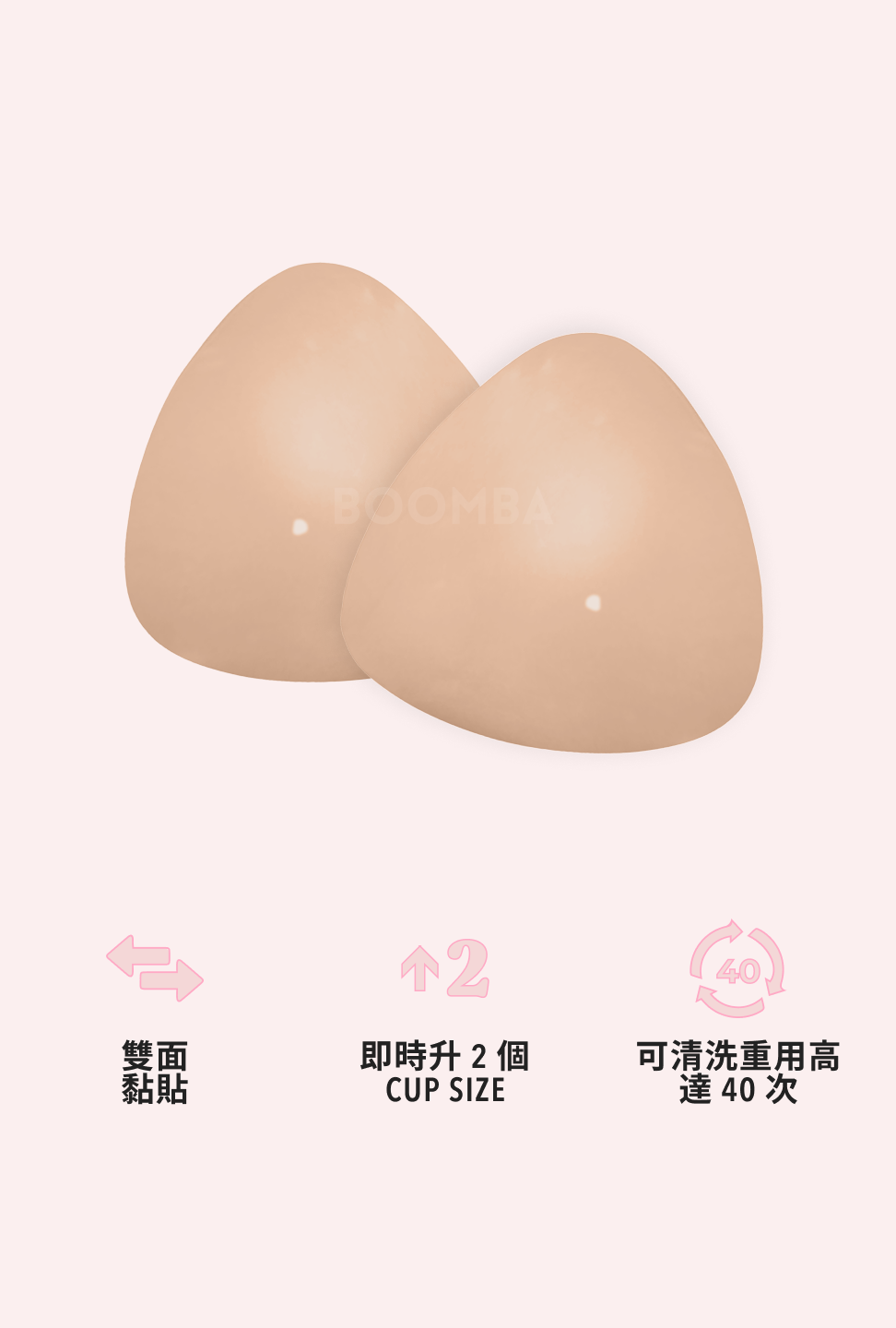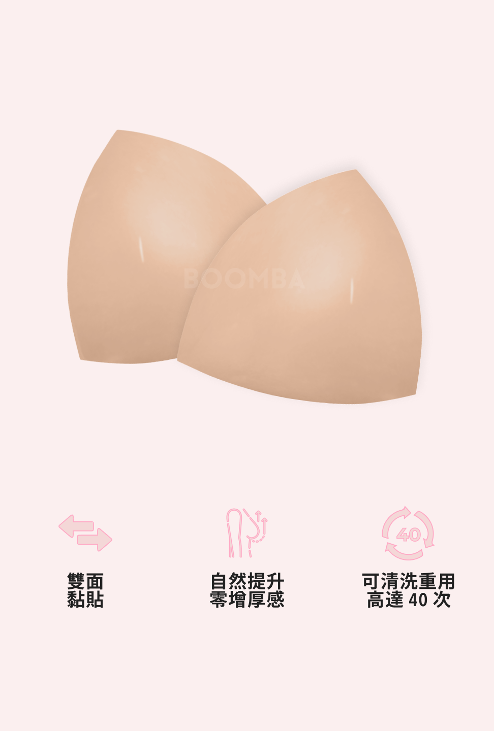 Double黏力,Double穩陣。BOOMBA 嘅胸墊地同時緊貼你嘅肌膚同衣物,提供持久隱形效果。