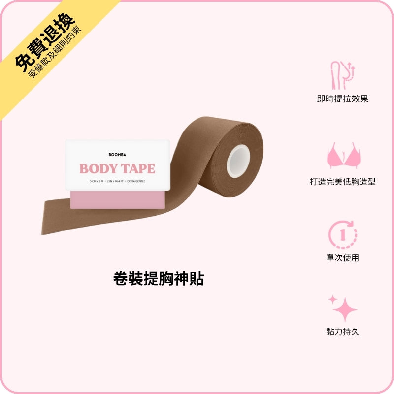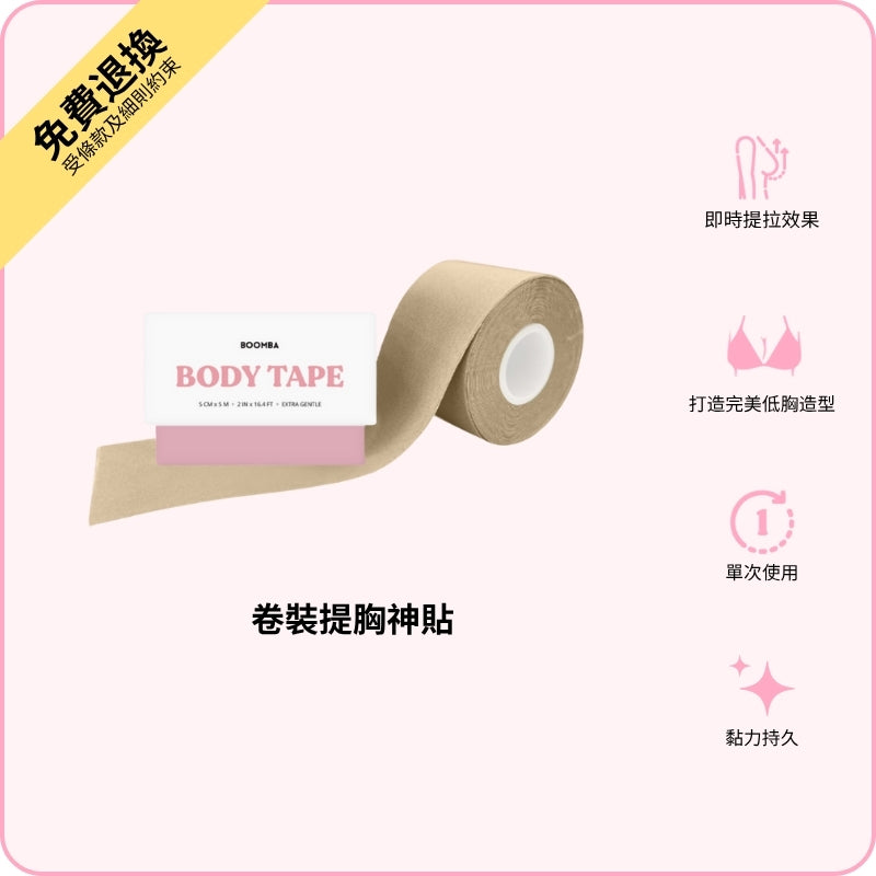 BOOMBA's Body Tape can be worn in various ways. Designed to contour with your shapes, our body tape is gentle yet strong, providing long-lasting results for up to 12 hours.
