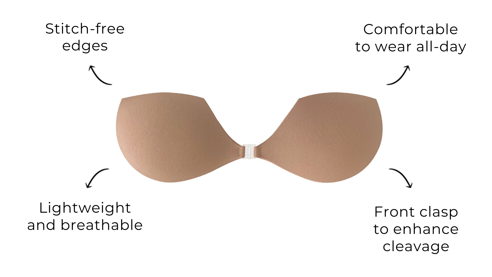 BOOMBA’s Demi Sticky Bra has a unique patented design. The bra cups in our Demi Sticky Bra are cut lower to ensure it always stays hidden under your top. The bra cups mold to fit your natural curves to provide natural-looking cleavage. Its stitch-free edging ensures it stays smooth under your clothing for a seamless look.