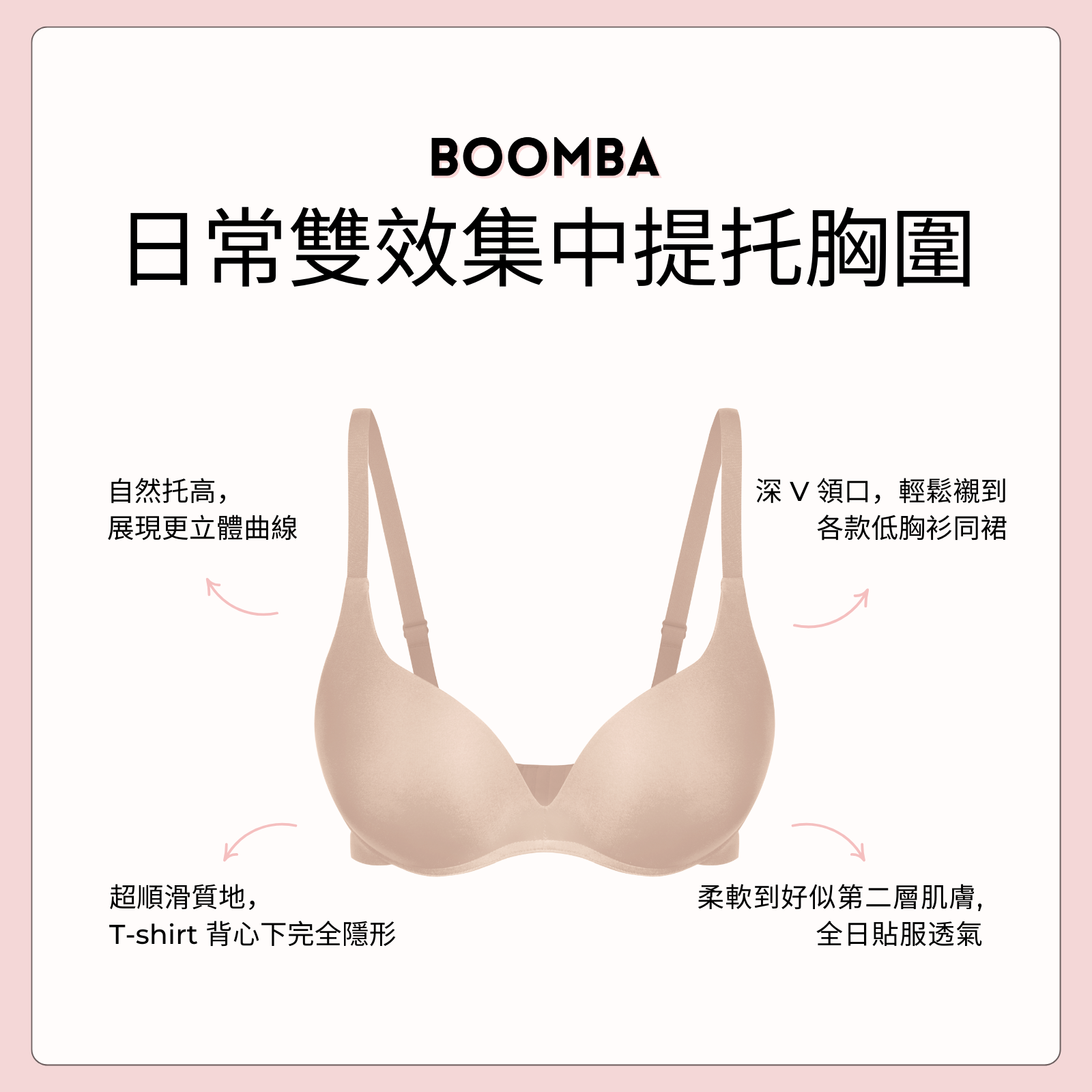 您嘅完美 Push-Up bra:BOOMBA 日常雙效集中提托胸圍。專為提升、塑形同增強效果而設,雙重加墊帶來更明顯嘅集中效果,同時保持全天候舒適。深 V 設計完美配搭 V 領同低胸衫,幫您打造一直想要嘅自然胸線。