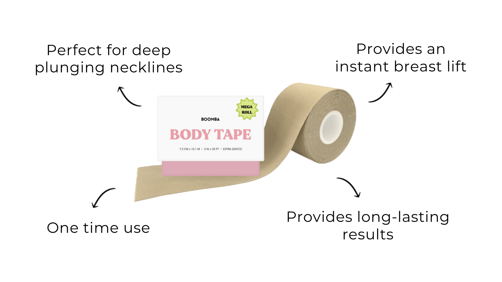 BOOMBA's Mega Body Tape can be worn in various ways. Designed to contour with your shapes, our body tape is gentle yet strong, providing long-lasting results for up to 12 hours.