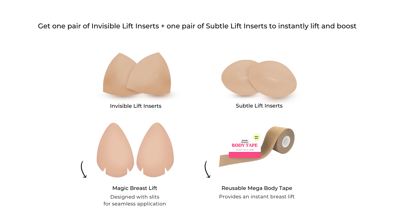 Designed to keep your curves looking naturally lifted and smooth without the hassle of wires or straps. Perfect for plunging necklines, backless outfits, and even swimwear! This bundle will keep you feeling supported and looking fabulous all day long.