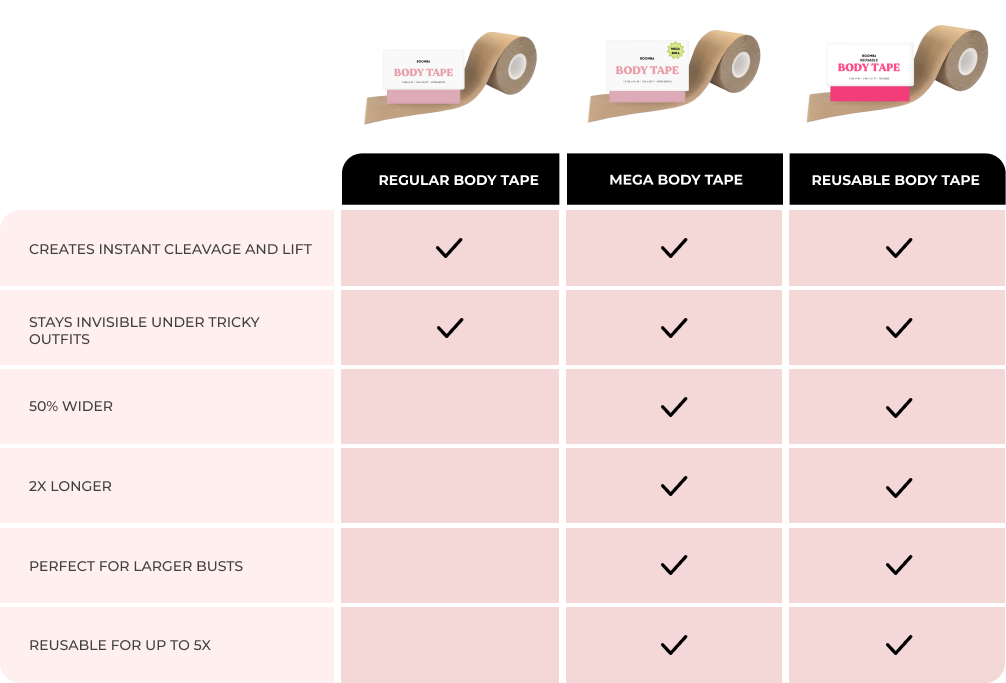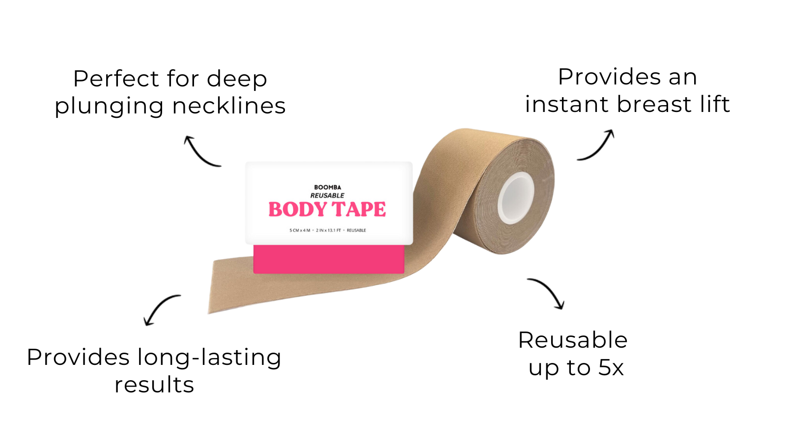 BOOMBA's Reusable Body Tape can be reusable up to five times. Designed to contour with your shapes, our body tape is gentle yet strong, providing long-lasting results for up to 12 hours.