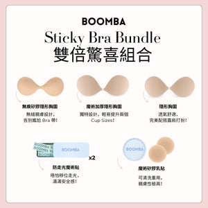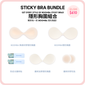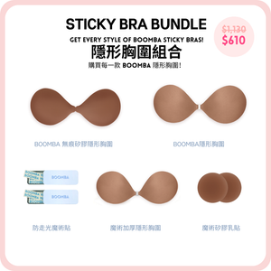 Be prepared for any outfit. This BOOMBA sticky bra bundle includes our best selling Invisibra, Sticky Bra AND our newest addition, the Magic Padded Sticky Bra! It also includes our famous Magic Nipple Covers, along with 2 tins of BOOMBA Magic Strips.