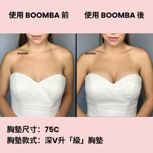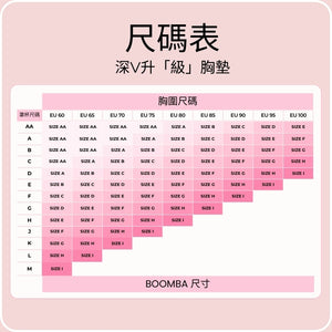 對於 75J 或以上尺寸,BOOMBA 超級升「級」胸墊(雙 Push Up)尺寸可達 75N;隱形提升胸墊(薄墊)尺寸可達 75T。