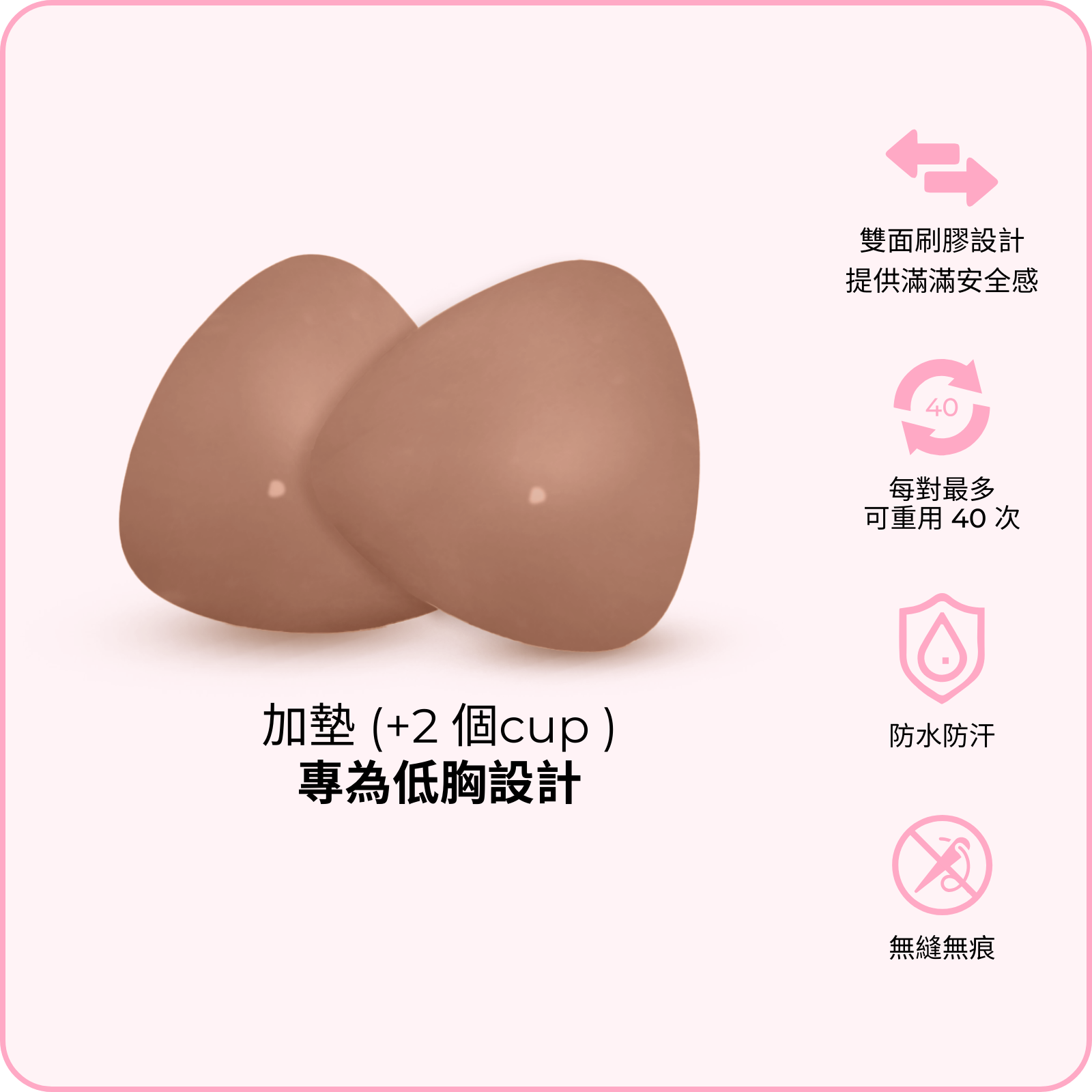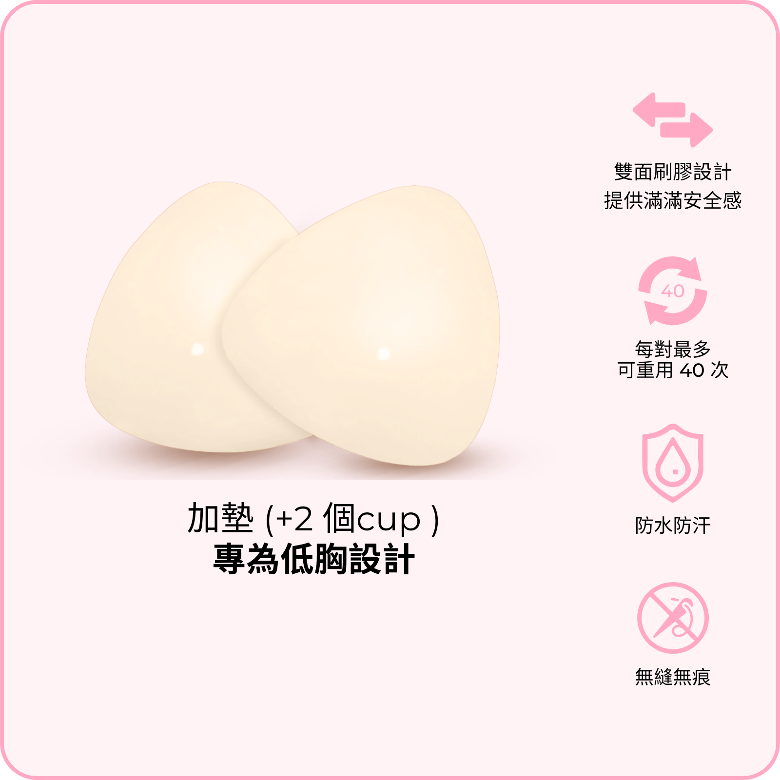 隱形提升胸墊: 薄墊款式,專門提拉塑形,唔會額外升 Cup,最啱配搭 Deep V 打扮同三角形比堅尼。