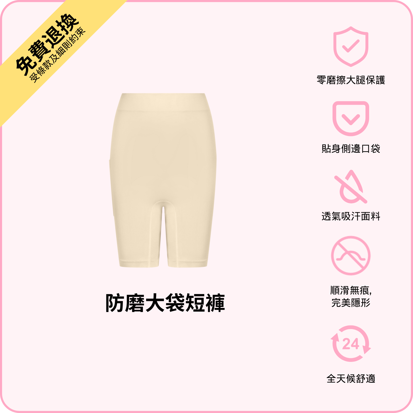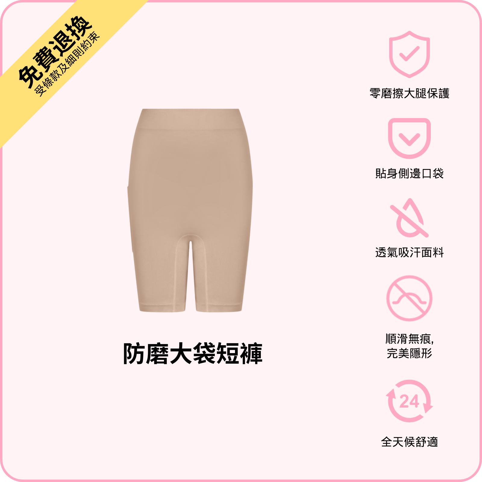 超柔軟、透氣面料喺大腿之間形成順滑保護層,行走一整日都自在。低調口袋可放手機、卡片或鎖匙,輕巧不顯,舒適又方便。