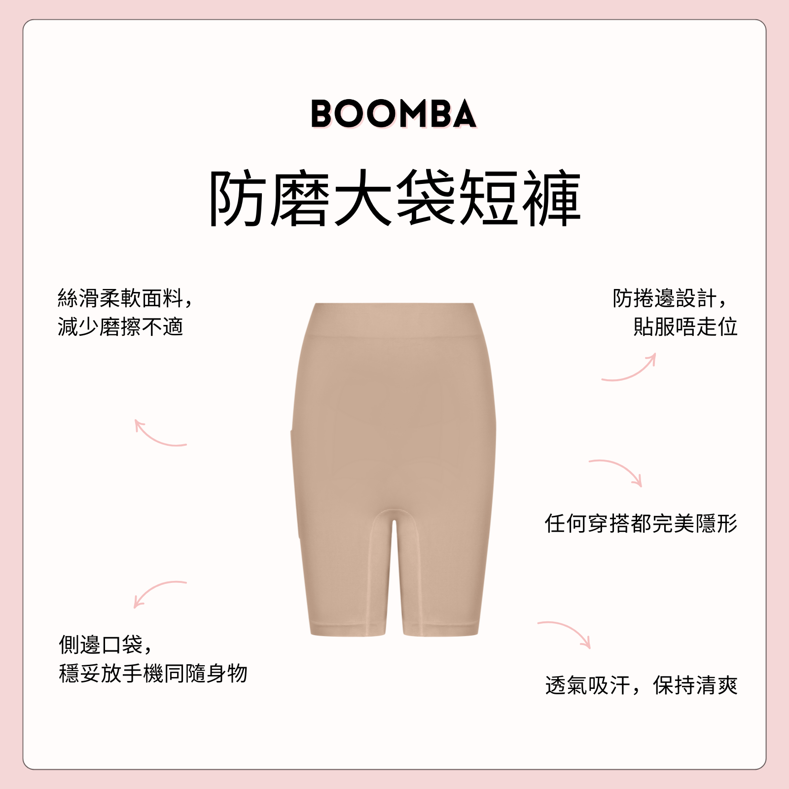 終於同大腿磨擦講拜拜。 BOOMBA 防磨口袋短褲結合經典舒適剪裁同實用側邊口袋,貼身又安心。