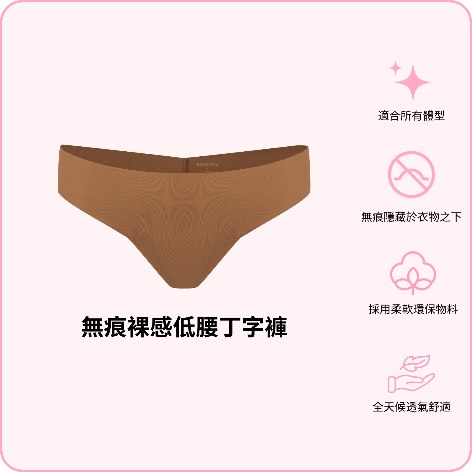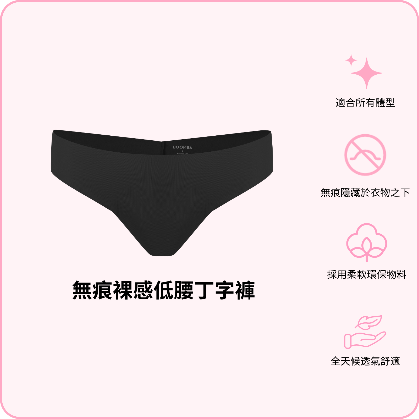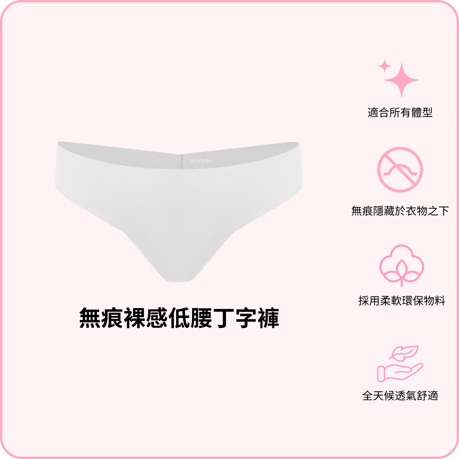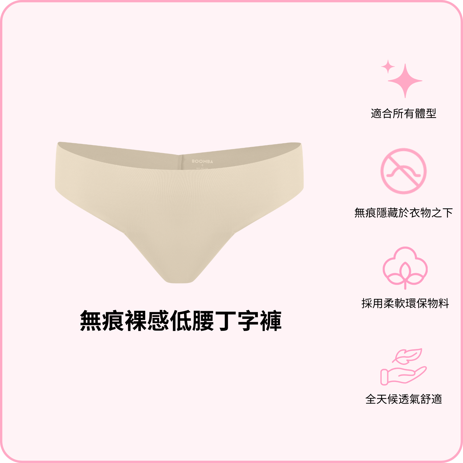 介紹 BOOMBA 無痕裸感低腰丁字褲 - 輕盈無縫,舒服到你會唔記得自己有著!低腰設計配合丁字剪裁,就係無痕舒適嘅秘密武器。同尷尬內褲痕講再見,著全日都冇問題,舒適就係咁簡單!