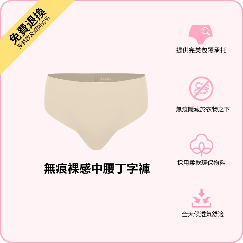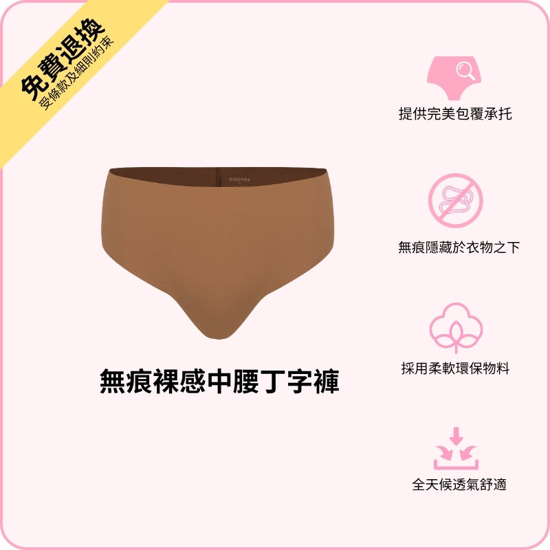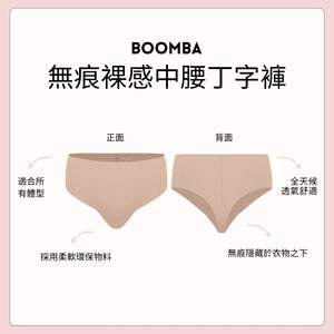全新推出BOOMBA 無痕裸感中腰丁字褲 – 著起嚟好似肌膚咁貼身,但更加迷人!採用超柔軟無縫物料,呢款丁字褲可以隱藏於衣物之下,著全日都咁舒服。中腰設計完美平衡包覆度同時尚感,最啱日常造型配搭!