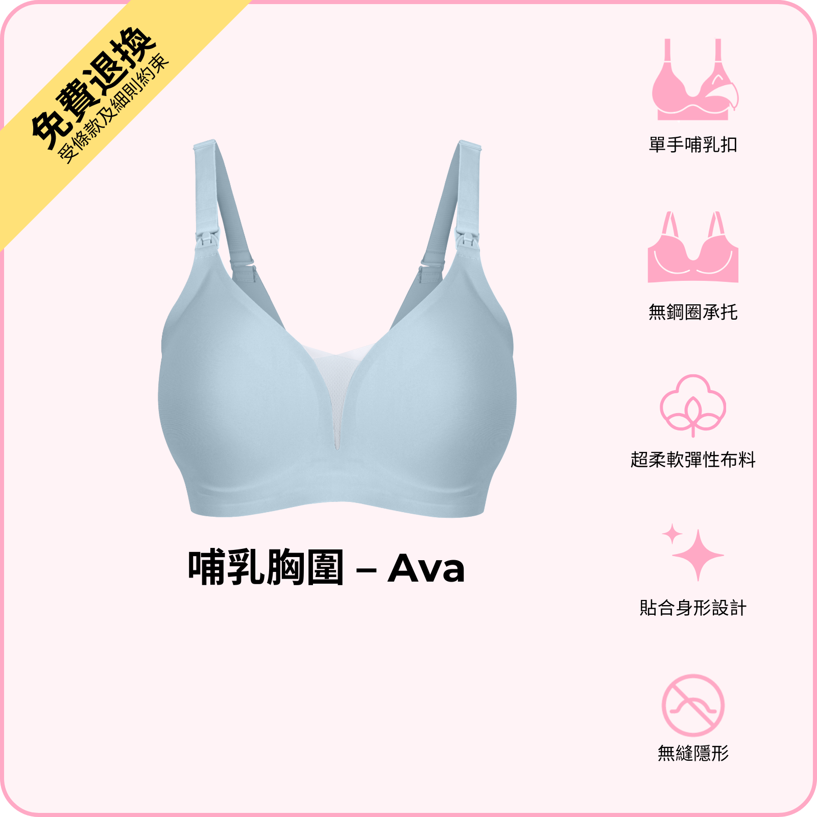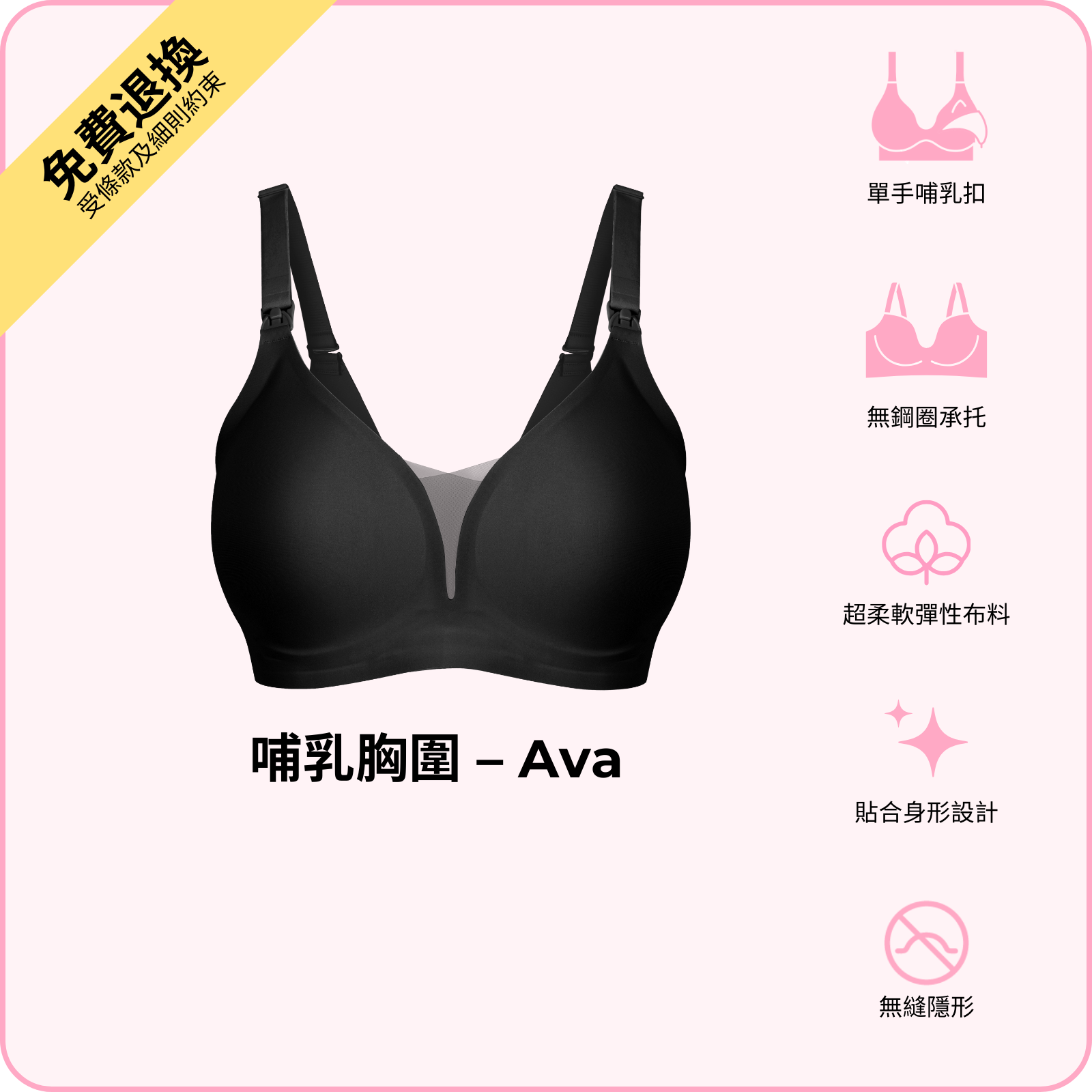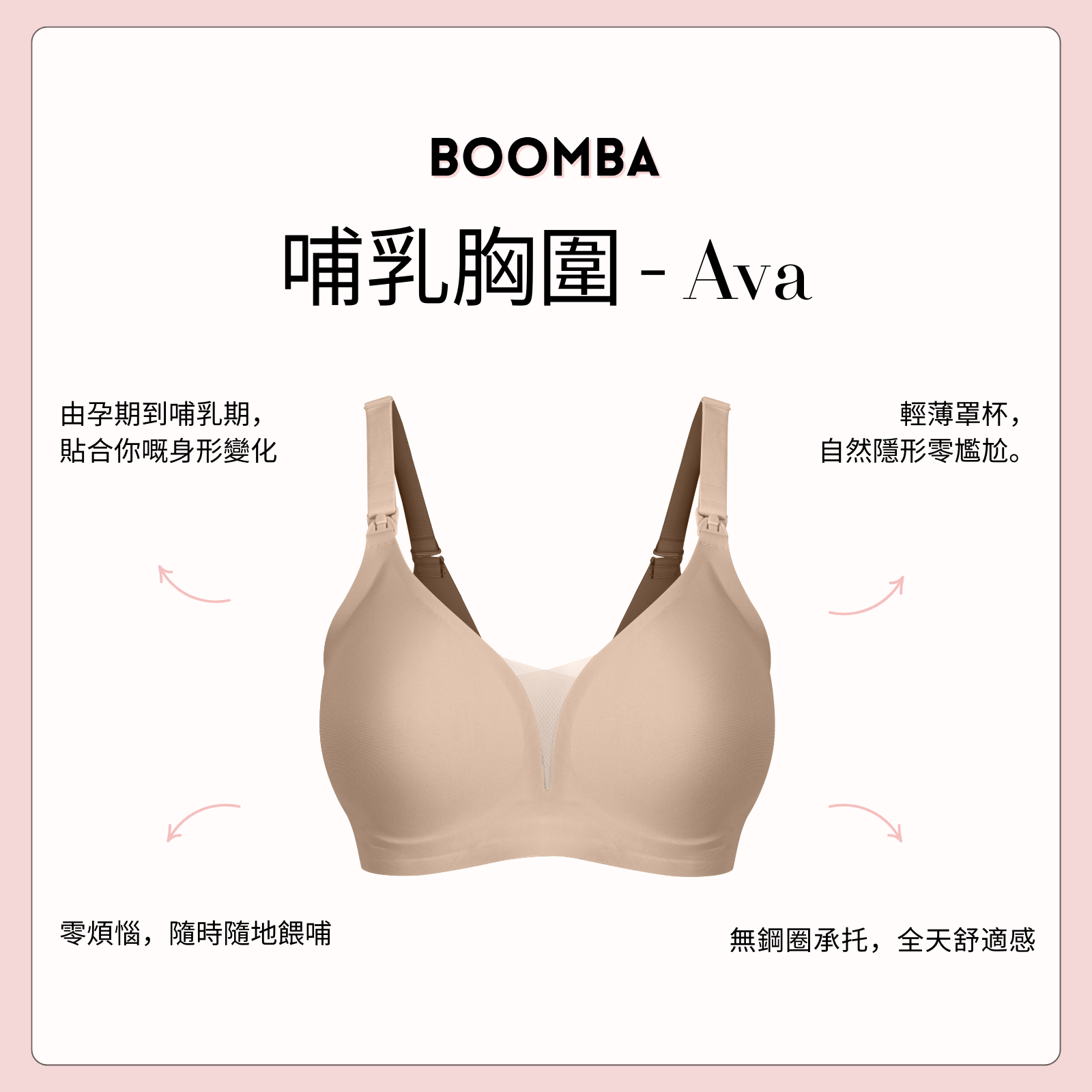 BOOMBA 哺乳胸圍 - Ava 以無鋼圈設計,配合單手哺乳扣,令餵哺變得輕鬆自在。採用超柔軟高 性布料,隨著身形變化而貼合,同時提供承托同提升效果。精選高質物料洗極都能保持挺身,唔變形,唔會鬆。