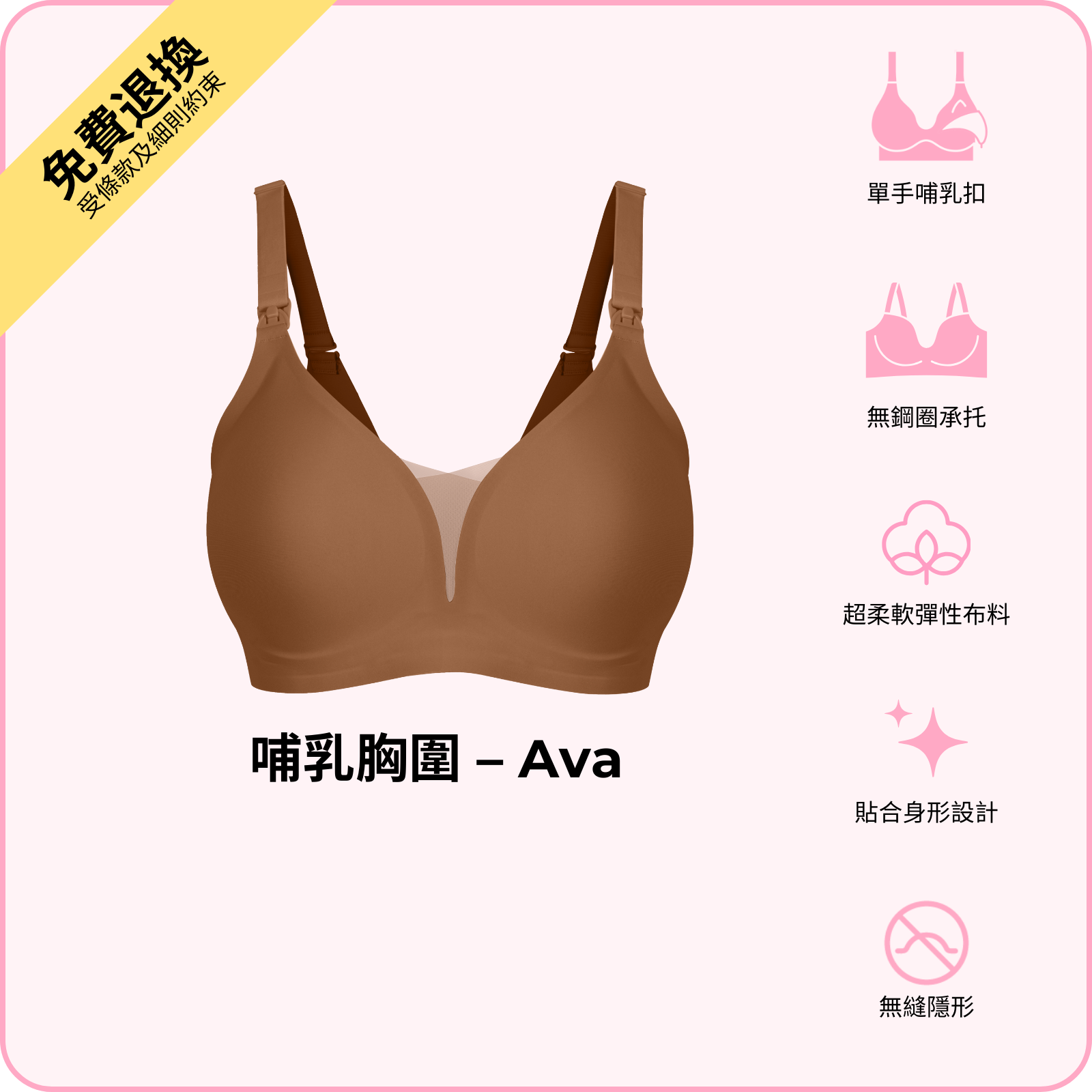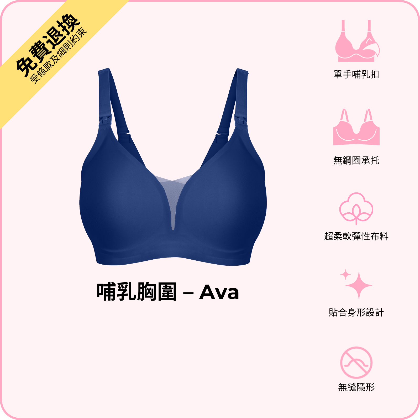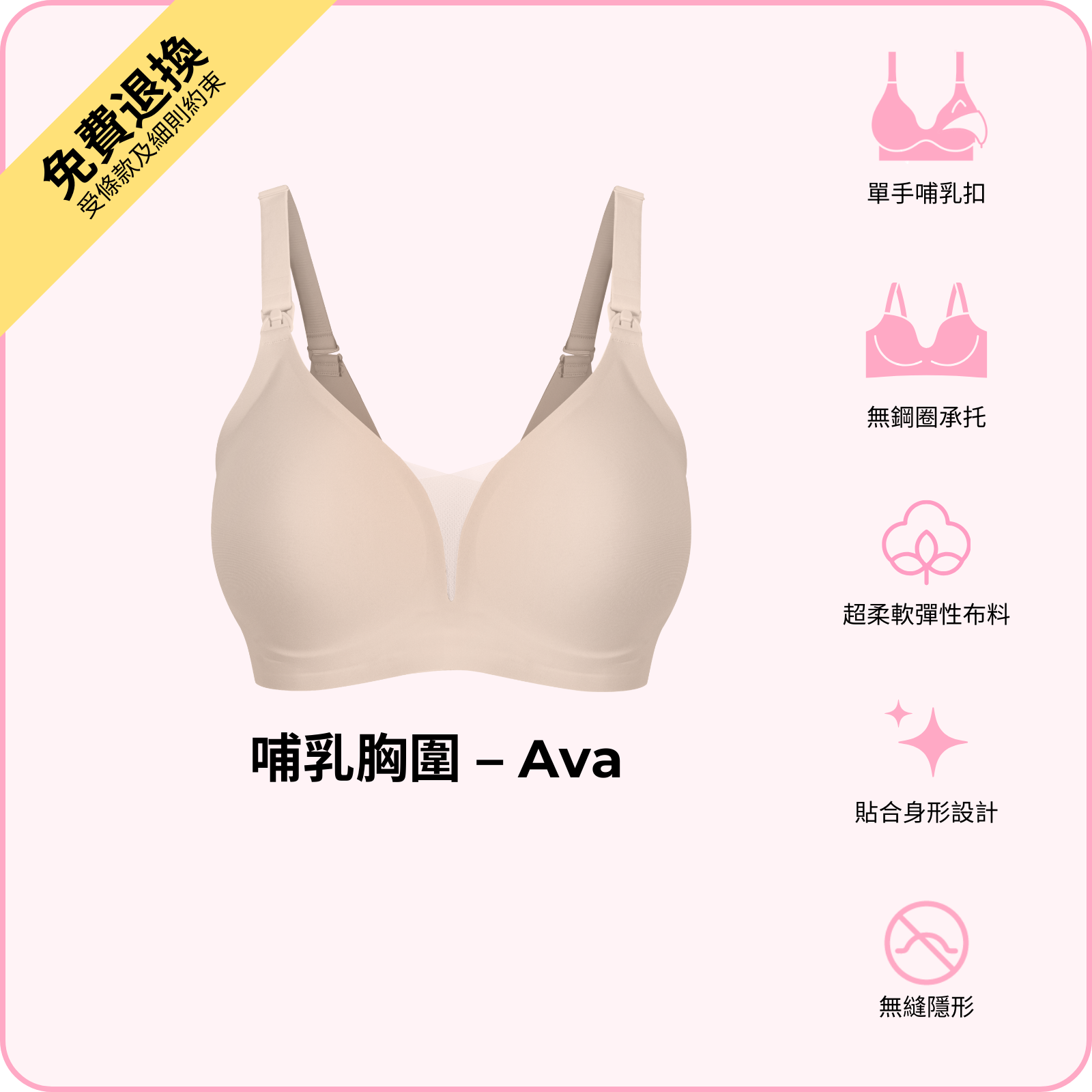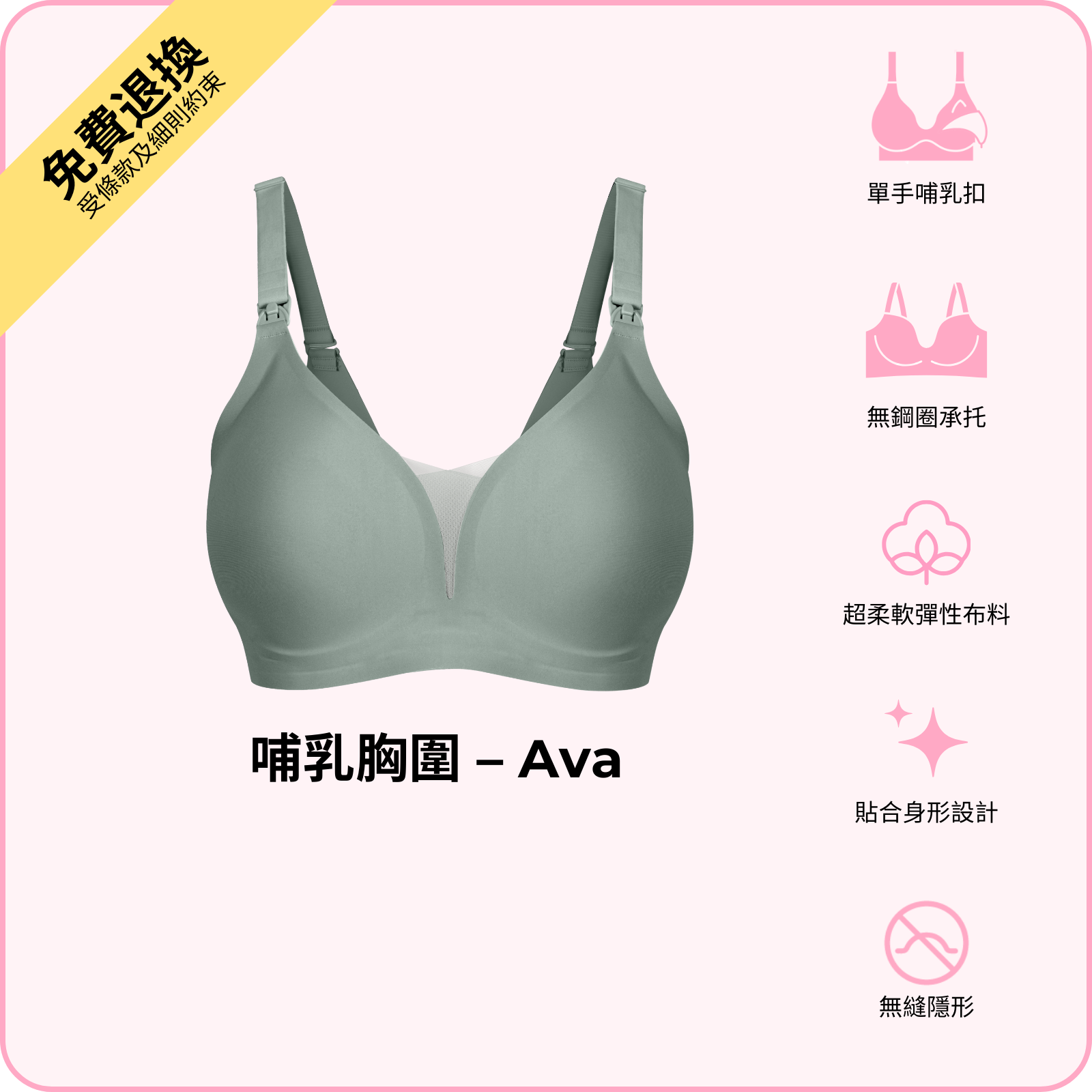 BOOMBA 哺乳胸圍 - Ava 以無鋼圈設計,配合單手哺乳扣,令餵哺變得輕鬆自在。採用超柔軟高 性布料,隨著身形變化而貼合,同時提供承托同提升效果。精選高質物料洗極都能保持挺身,唔變形,唔會鬆。