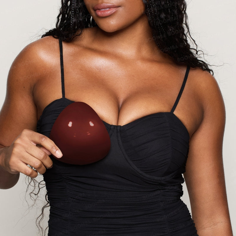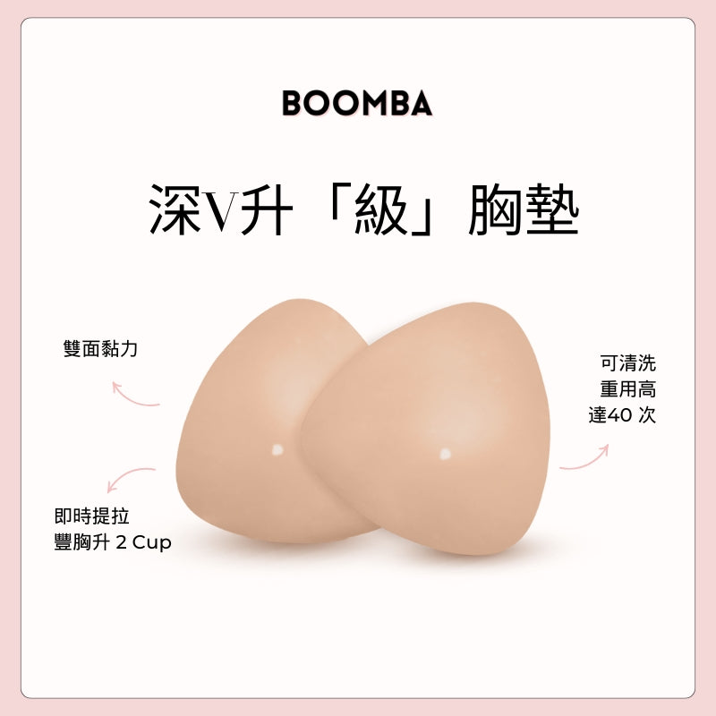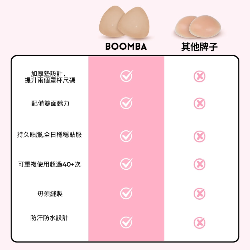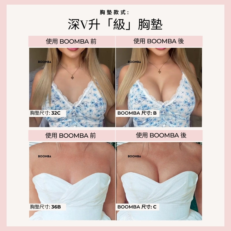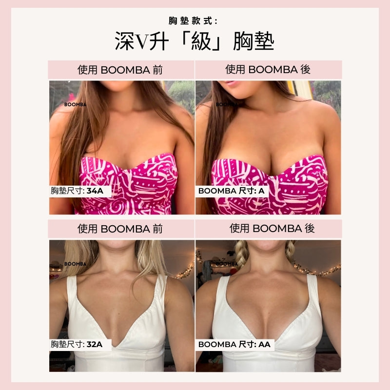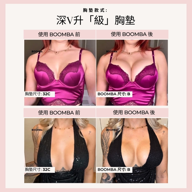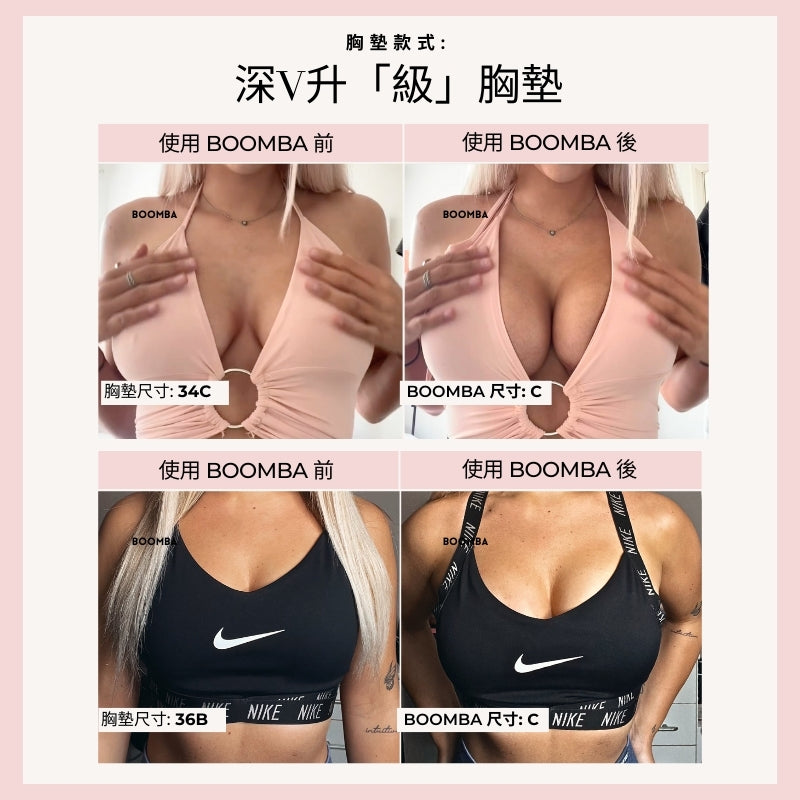請注意,成效因乳房大小和形狀而異,效果將類似於雙重提升胸圍。 BOOMBA 胸墊最適合用於天然乳房。