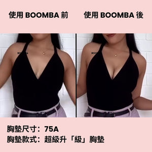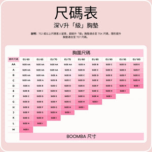 對於 75J 或以上尺寸,BOOMBA 超級升「級」胸墊(雙 Push Up)尺寸可達 75N;隱形提升胸墊(薄墊)尺寸可達 75T。