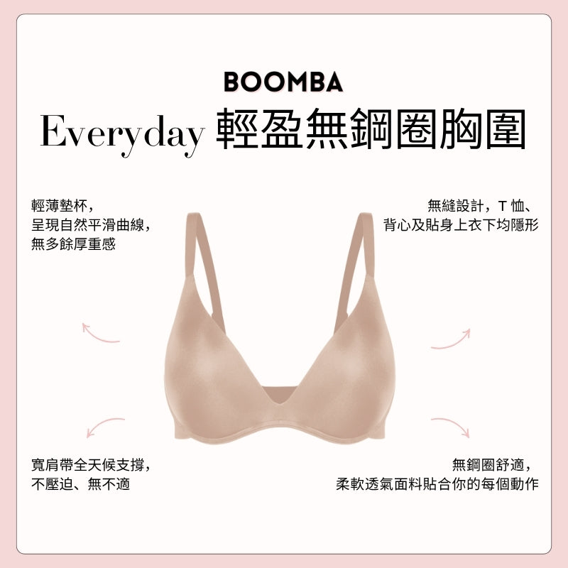 你的每日首選 —— BOOMBA Everyday 輕盈無鋼圈胸圍。無鋼圈、輕薄墊杯,加上加闊肩帶設計,帶來自然曲線與全天舒適感的完美平衡。
