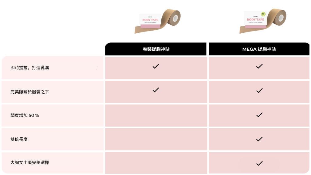 由於需求熱烈,提胸神貼而家有MEGA 版啦!我哋嘅 MEGA 卷裝提胸神貼闊度比起常規增加50%,長度仲係常規既 2 倍!