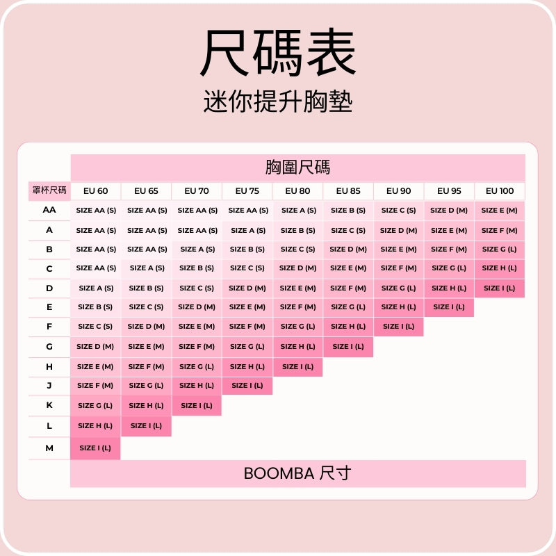 迷你提升胸墊細碼將以細碼將以 AA-C Cup 發貨、中碼為 D-F Cup發貨、大碼為 G-I Cup發貨。