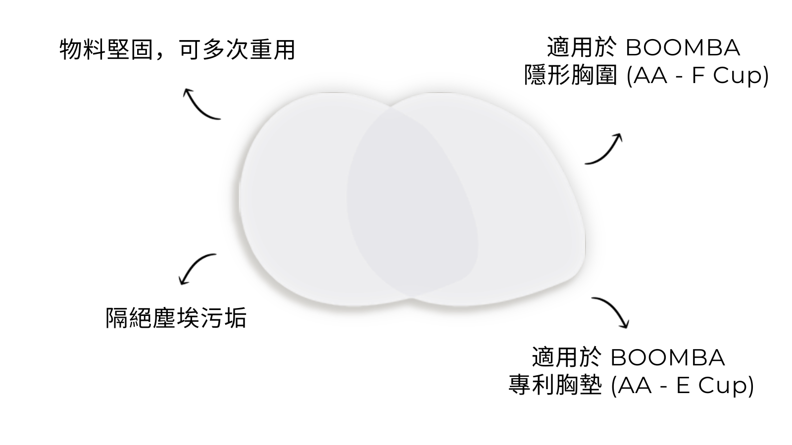 適合 BOOMBA 無痕矽膠隱形胸圍、低胸隱形胸圍、隱形胸圍(AA - F Cup)或全系列 3 種款式胸墊(AA - E Cup)