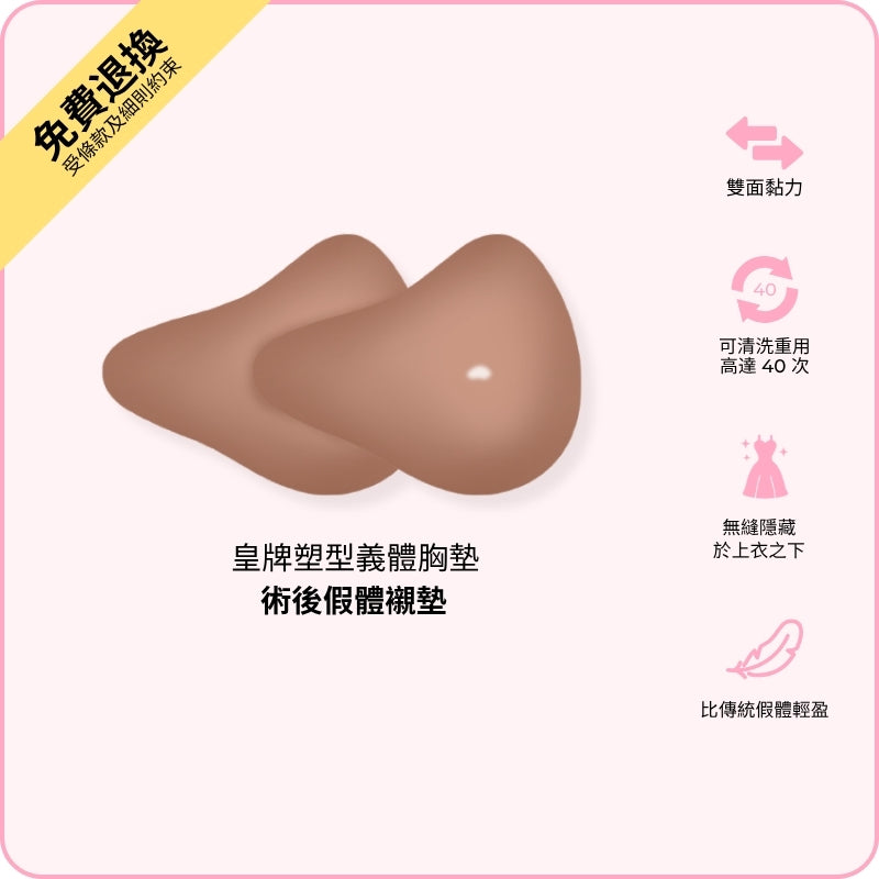 雙面黏力:義體胸墊雙面都有特強黏力,可以黏緊上衣同皮膚,適合全天候穿著。