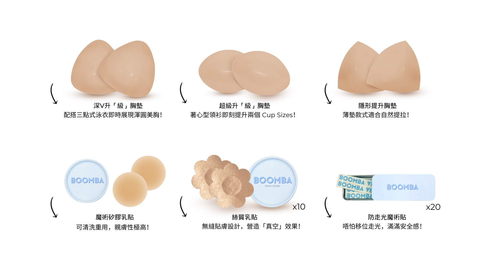BOOMBA 胸墊同一般由黏合劑支撐嘅隱形胸圍唔同,必須配合貼身、有結構嘅上衣先有最佳效果。產品本身無法獨立支撐。