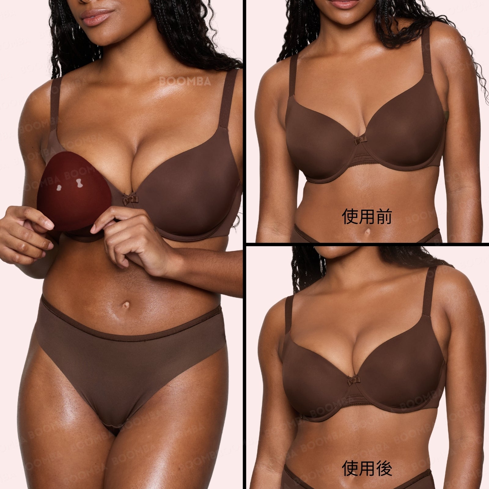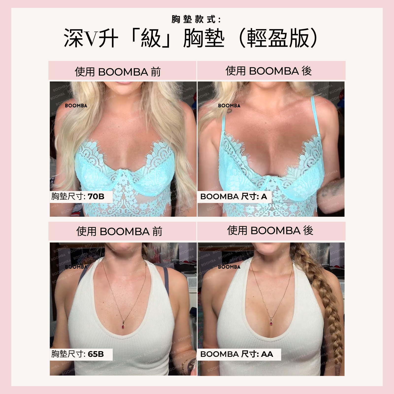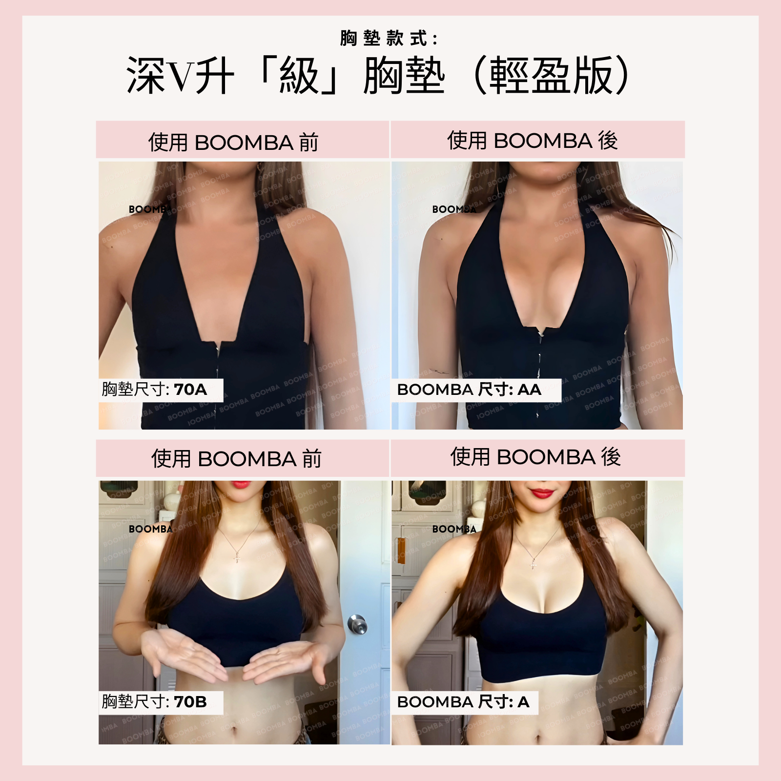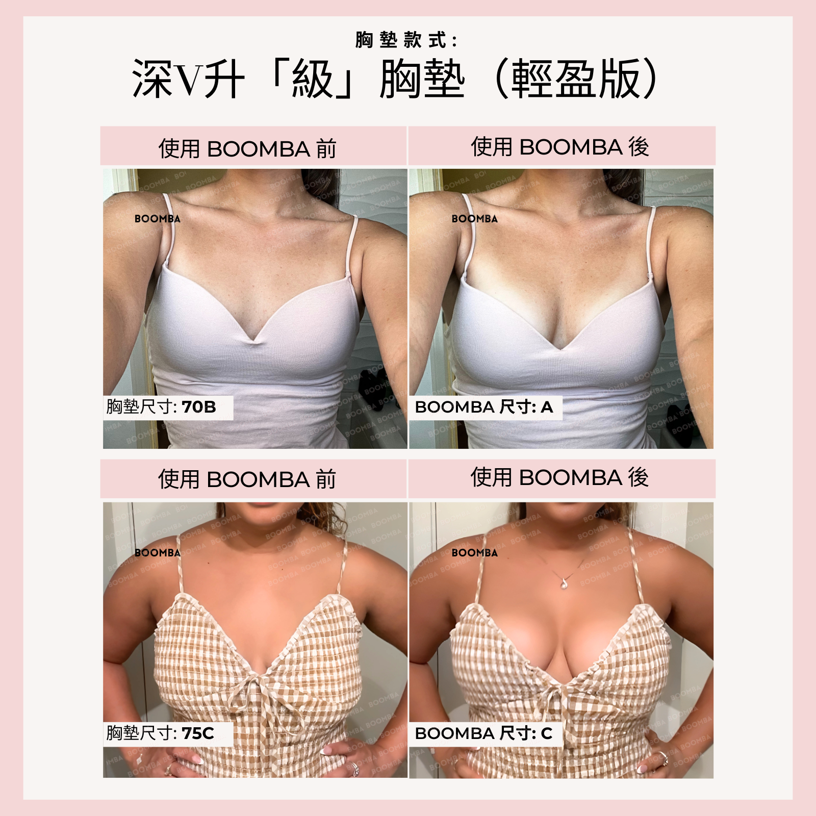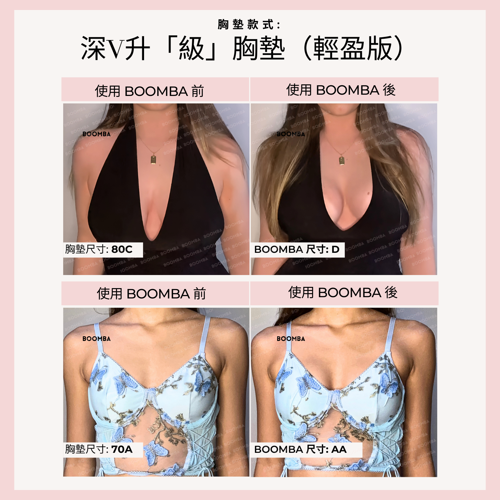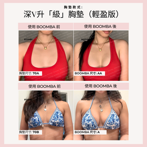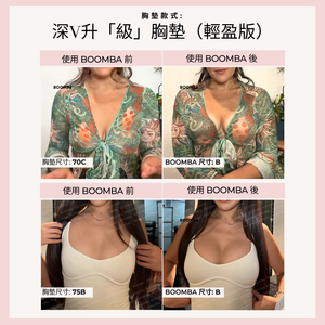 • “BOOMBA 的深V升「級」胸墊並不是在開玩笑說‘升「級」’。作為使用的胸墊最多的產品之一,它為你提供帖服舒適的自然提升效果。”